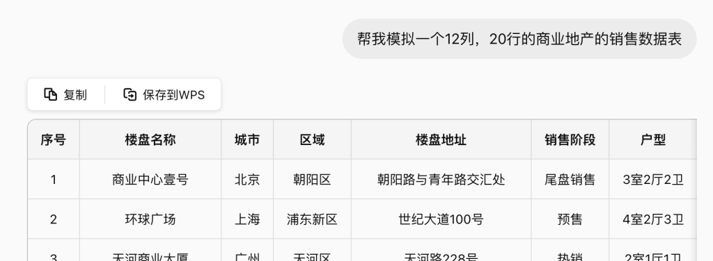 数据生成以后,可以鼠标悬浮在数据上,点击“保存到WPS”把生成的数据保存到WPS云端【需要占用帐号云端存储空间】,如图所示: